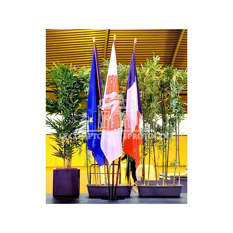 ENSEMBLE CLASSIQUE socle triple et 3 drapeaux maille polyester simple face 100x150cm, montés sur hampe vernie de prestige 2.20m