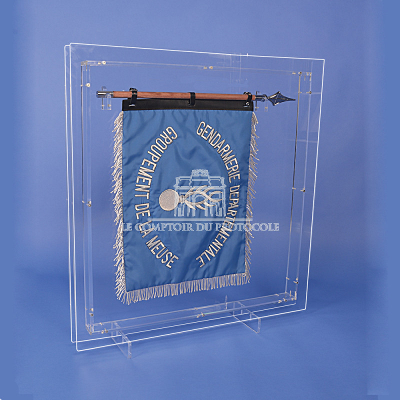 Vitrine présentoir porte-drapeau en qualité altuglass, pour fanion avec hampe.