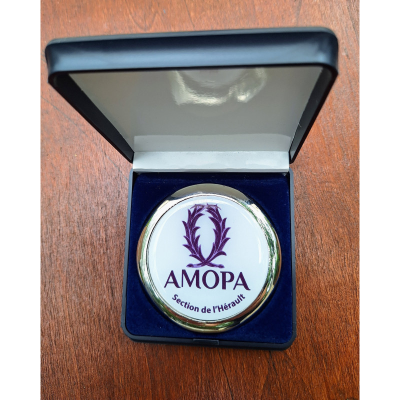 En option, à l’unité selon votre demande ponctuelle, possibilité de graver une plaquette   personnalisée qui sera apposée sur l’écrin (+ 18€ ttc) ou une gravure au revers de la médaille (+25€ ttc). Nous consulter pour un devis.