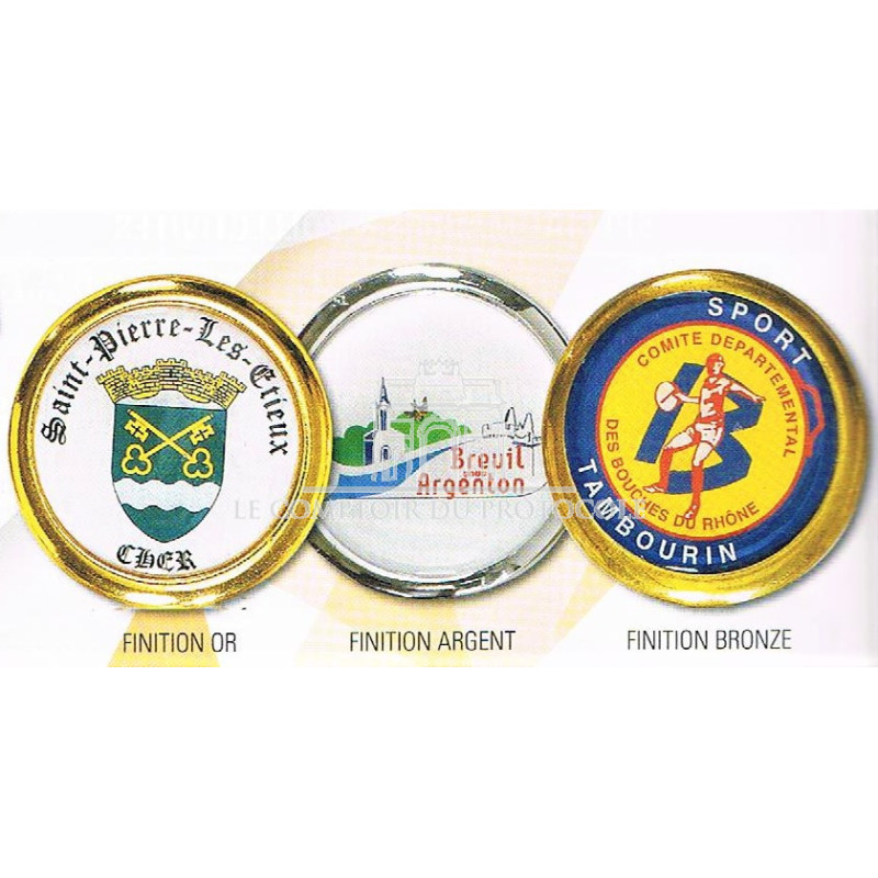 Médailles personnalisées 70mm de coloris doré ou argenté, sur lesquelles sont posées un dôme résine couleur selon votre logo.