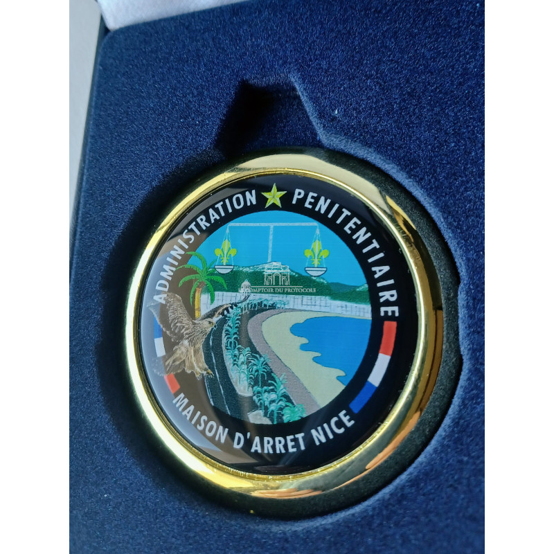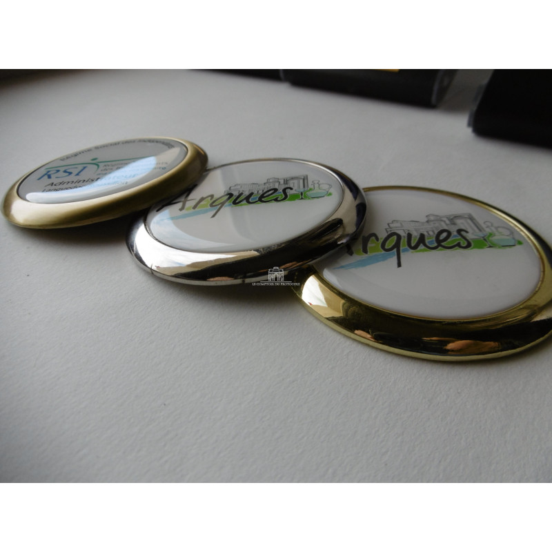 Médailles de ville personnalisé 70mm de coloris doré ou argenté, sur lesquelles sont posées un dome résine couleur selon votre logo, photo, ou image fournie.