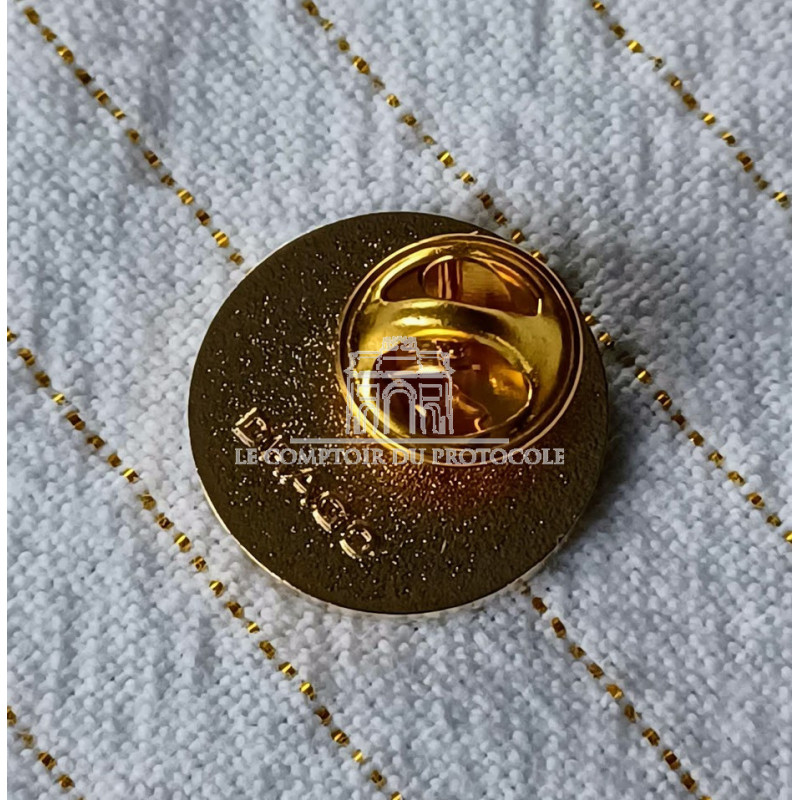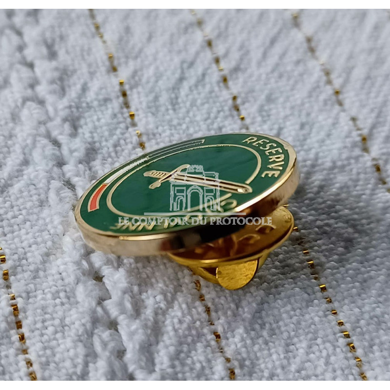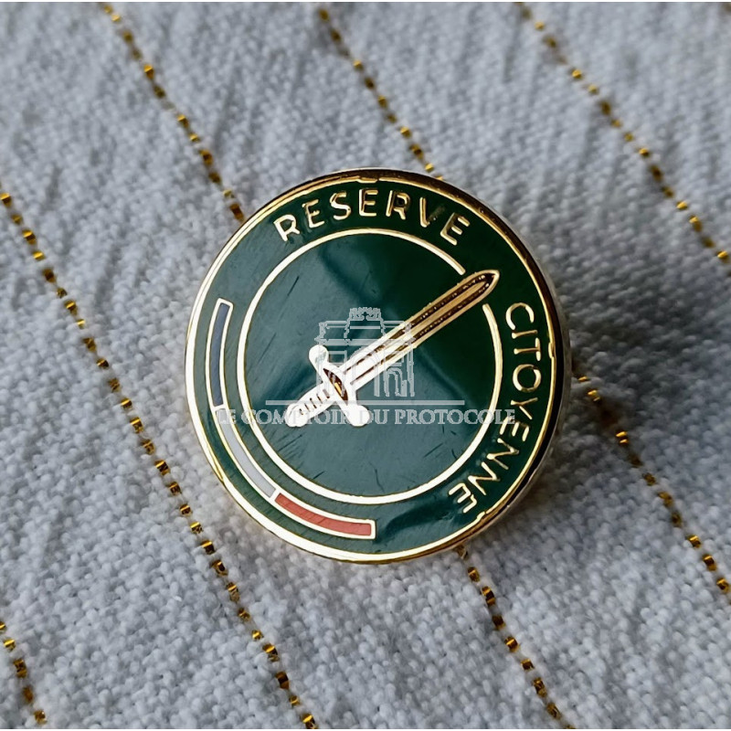 Pin's pour la Réserve Citoyenne d'un diamètre de 20 mm en laiton estampé vert avec une finition dorée.
