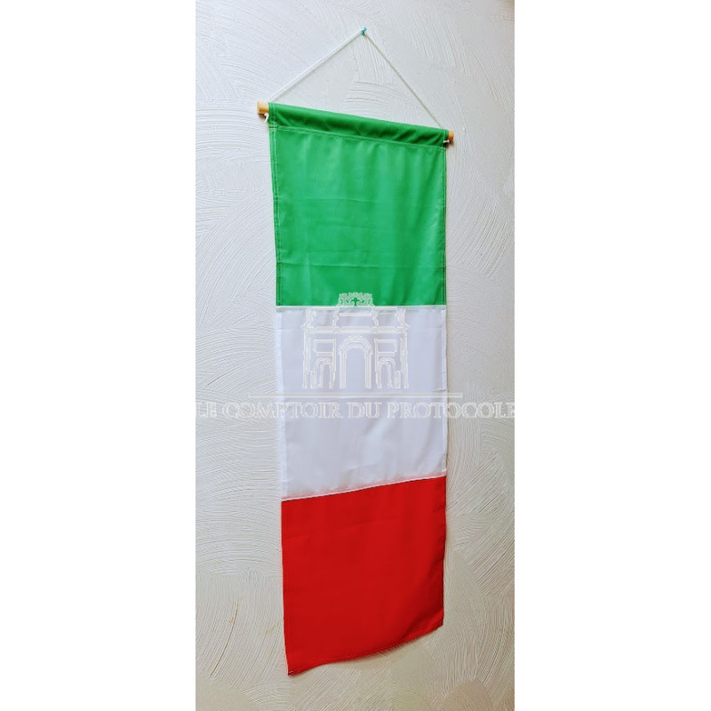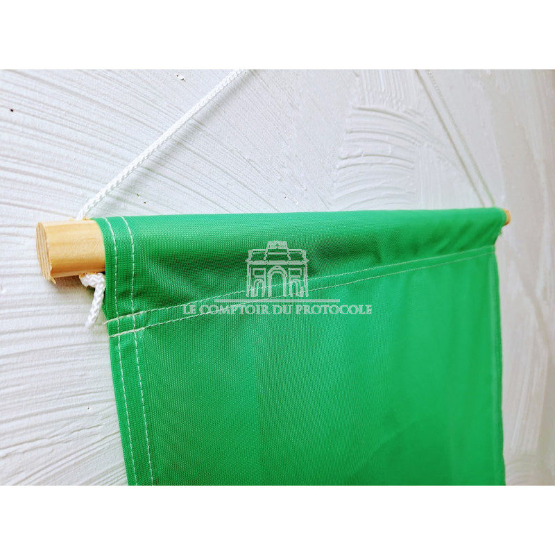 | Structure | Tissu ourlé sur les côtés ; monté sur une traverse en bois, avec une drisse de suspension. Finition en bas de l’oriflamme en queue de pie, ou en coupe droite (option à préciser). |