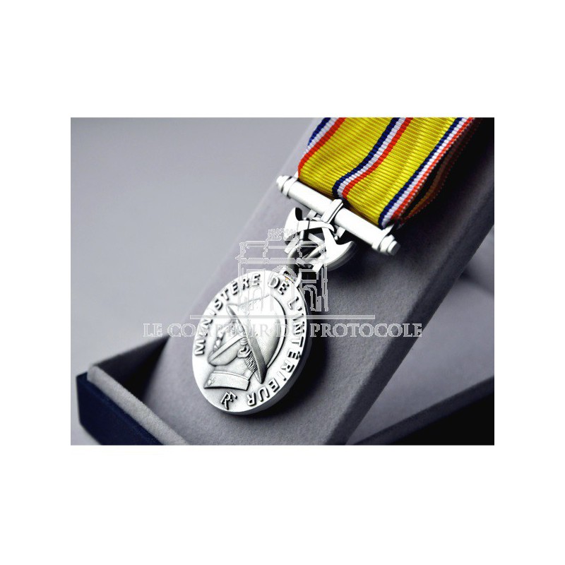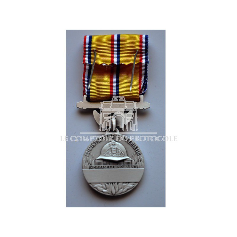 L'inscription "Ministère de l'Intérieur" est située en haut ainsi que la mention "Hommage au Dévouement" qui est au-dessus d'un cartouche rectangulaire, où se grave le nom et la date de la personne décorée.