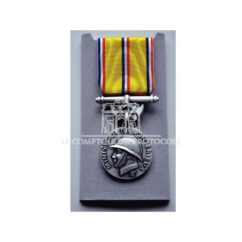 La médaille des Sapeurs-Pompiers 20 ans échelon ARGENT, en bronze argenté, représente un sapeur-pompier coiffé de son casque entouré de l'inscription "Ministère de l'intérieur" et "RF".