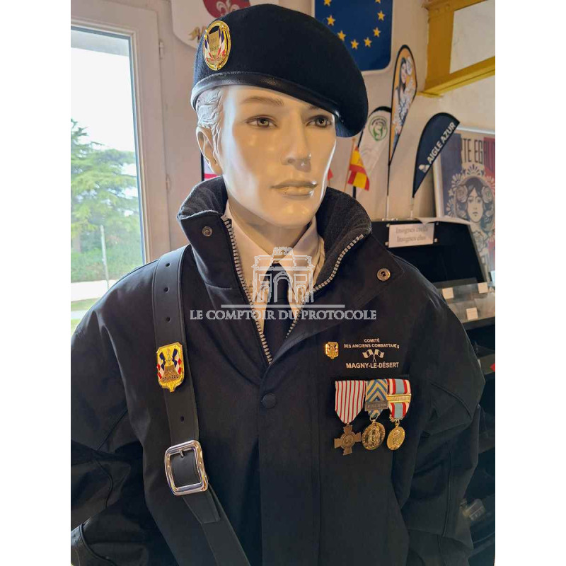 Feutrine noir épais, cousu, renforcé, semi rigide destiné aux médailles pendantes pour les tenues officielles (gendarmerie, sapeurs pompiers, police nationale, etc) ou les médailles associatives, côté droit de la veste, opposé au coeur, en opposition aux décorations civiles côté coeur.