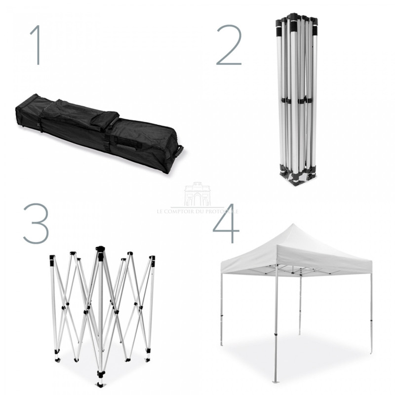 Notre modèle de tente standard de 300 X 300 cm est entièrement imprimable et ce, pourvu des caractéristiques suivantes :
